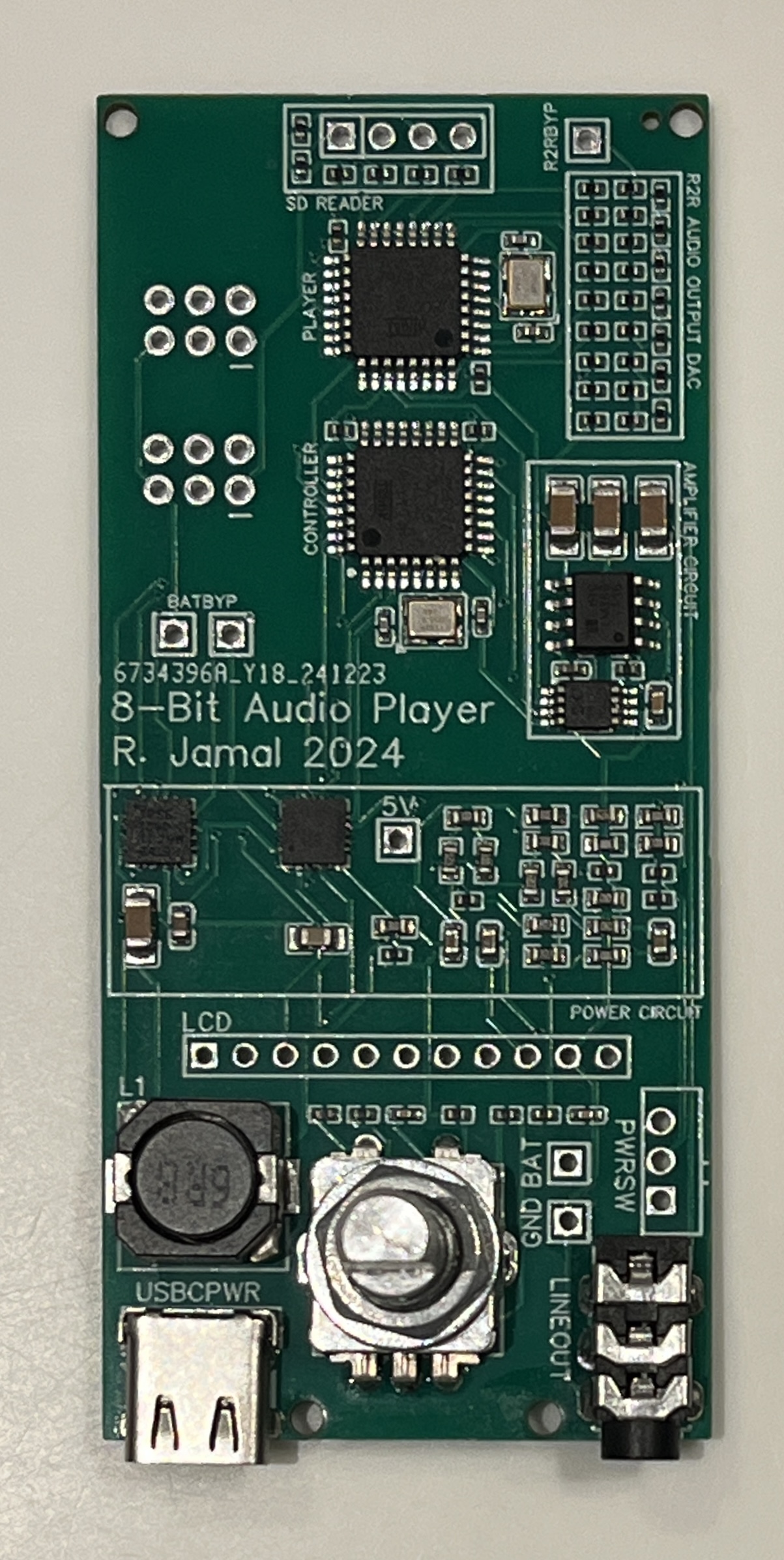 The 8-Bit Audio Player makes use of an R/2R ladder and 8-bit, 16 KHz WAV files. In this configuration, an ATmega328P reads audio samples from an SD card, and sequentially outputs the samples onto the R/2R ladder at a rate of 16 KHz. The raw signal from the output of the R/2R DAC is filtered through a capacitor in a low-pass filter configuration. It is then amplified through an LM386 audio amplifier, before finally being sent to headphones through a 3.5 mm audio jack.