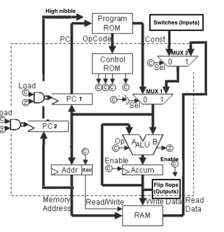 The standard CHUMP consists of several 4-bit busses and a 10-bit control bus that connect the various components together. The program counter starts at 0 and increments on each rising edge of the clock. The outputs of the program counter are fed directly into the program ROM which contains an OpCode and operand for each value of the program counter. The OpCode corresponds to a series of control bits and tells the processor which instruction to execute.