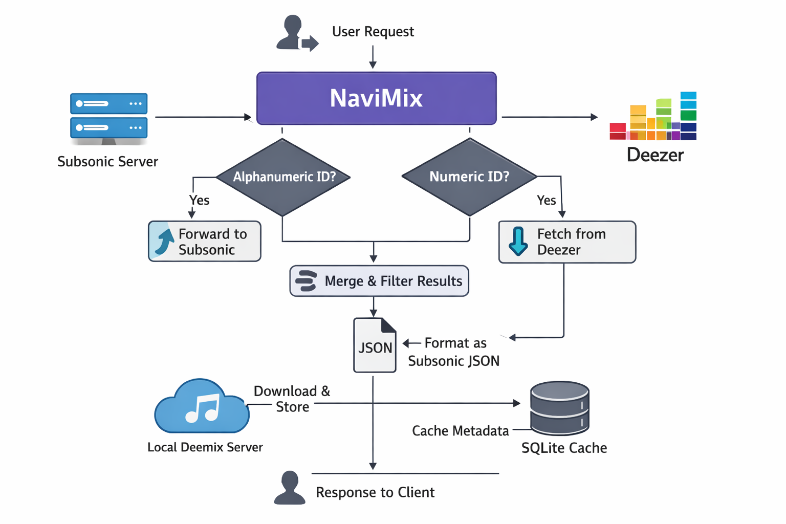 When Navimix receives a request, it first decides whether to forward it or to parse it and inject information. If it is a request like search, stream, or something to do with media retrieval, it will parse it. Otherwise, it forwards. In the subsonic server architecture, every track, album and artist is assigned a server-specific unique ID. These IDs are long alphanumeric strings. This works out well for Navimix as Deezer IDs are fully unique numeric codes. This both ensures there is no overlap between Deezer tracks and Subsonic tracks and also gives Navimix a simple way to check whether to forward an ID request to subsonic (if the ID contains letters), or whether to retreive the track from Deezer.